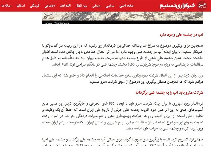 در ادامه امیر رحیمزاده مسئول اداره میراث فرهنگی شهرری که از پاسخهای طریق ازلی قانع نشده بود در جمع خبرنگاران گفت: میراث فرهنگی به عنوان متولی چشمه علی در مورد جاذبه گردشگری این چشمه در صورت بازنگشتن آب از مترو شکایت میکند.