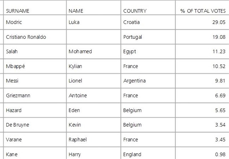 بر این اساس پس از لوکا مودریچ که با به دست آوردن 29.5 درصد آرا بهترین بازیکن نام گرفت،کریس رونالدو با 19.8 و محمد صلاح مصری با 11.23 آرا در ردههای دوم و سوم قرار گرفتند.
