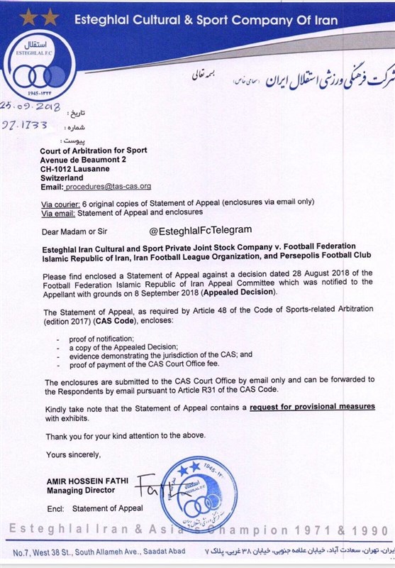 به گزارش خبرنگار ورزشی خبرگزاری تسنیم، پس از اعلام رای کمیته استیناف مبنی بر تایید بازنده شدن استقلال در پرونده سوپرجام باشگاه استقلال اعلام کرده بود که به دادگاه CAS شکایت خواهد کرد.