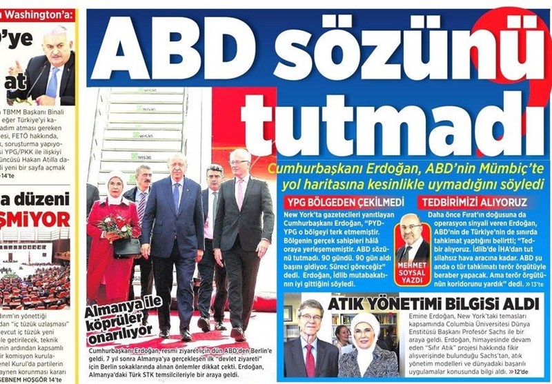 به گزارش گروه بینالملل خبرگزاری تسنیم، بسیاری از روزنامههای ترکیه، امروز در عکس و تیتر صفحه نخست، سفر اردوغان به آلمان را برجسته کردهاند. همچنین این روزنامهها موضوعات دیگری مانند وضعیت اقتصادی ترکیه را مورد توجه قرار دادهاند.