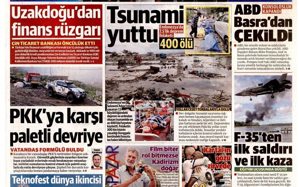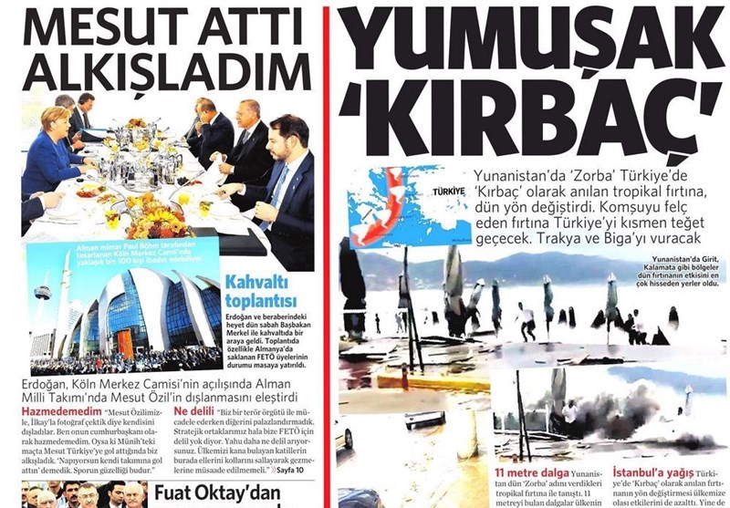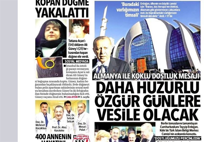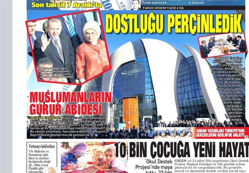 به گزارش گروه بین‌الملل خبرگزاری تسنیم، بسیاری از روزنامه‌های ترکیه، امروز در عکس و تیتر صفحه نخست، افتتاح بزرگترین مسجد آلمان توسط اردوغان را برجسته کرده‌اند. همچنین این روزنامه‌ها موضوعات دیگری مانند سونامی اندونزی را مورد توجه قرار دادند.