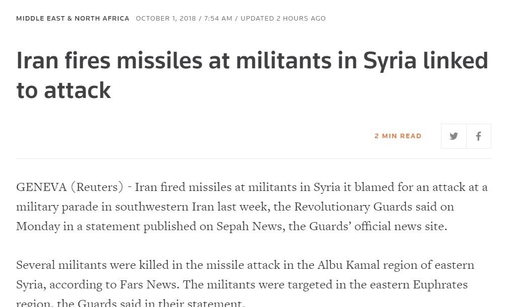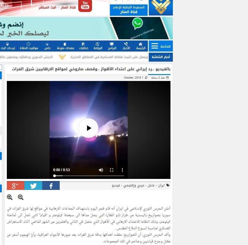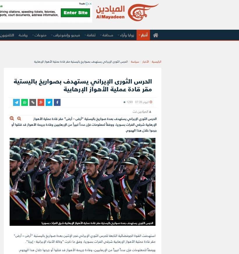 این گزارش تاکید کرد که رسانه‌های جمعی ایران تصاویری از حمله موشکی سپاه پاسداران به مقر گروه‌های تکفیری در شرق فرات را منتشر کردند که در واکنش به جنایت اهواز انجام شده است.