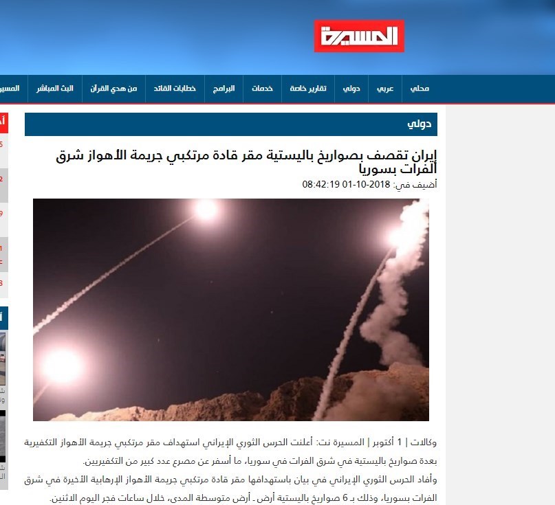 پایگاه خبری المسیره نیز گزارش داد که سپاه پاسداران انقلاب اسلامی مقرر عناصر تروریست های عامل حادثه اهواز را با چندین موشک بالستیک هدف قرار داد که در نتیجه این حمله تعداد زیادی از عناصر تکفیری کشته شدند.
