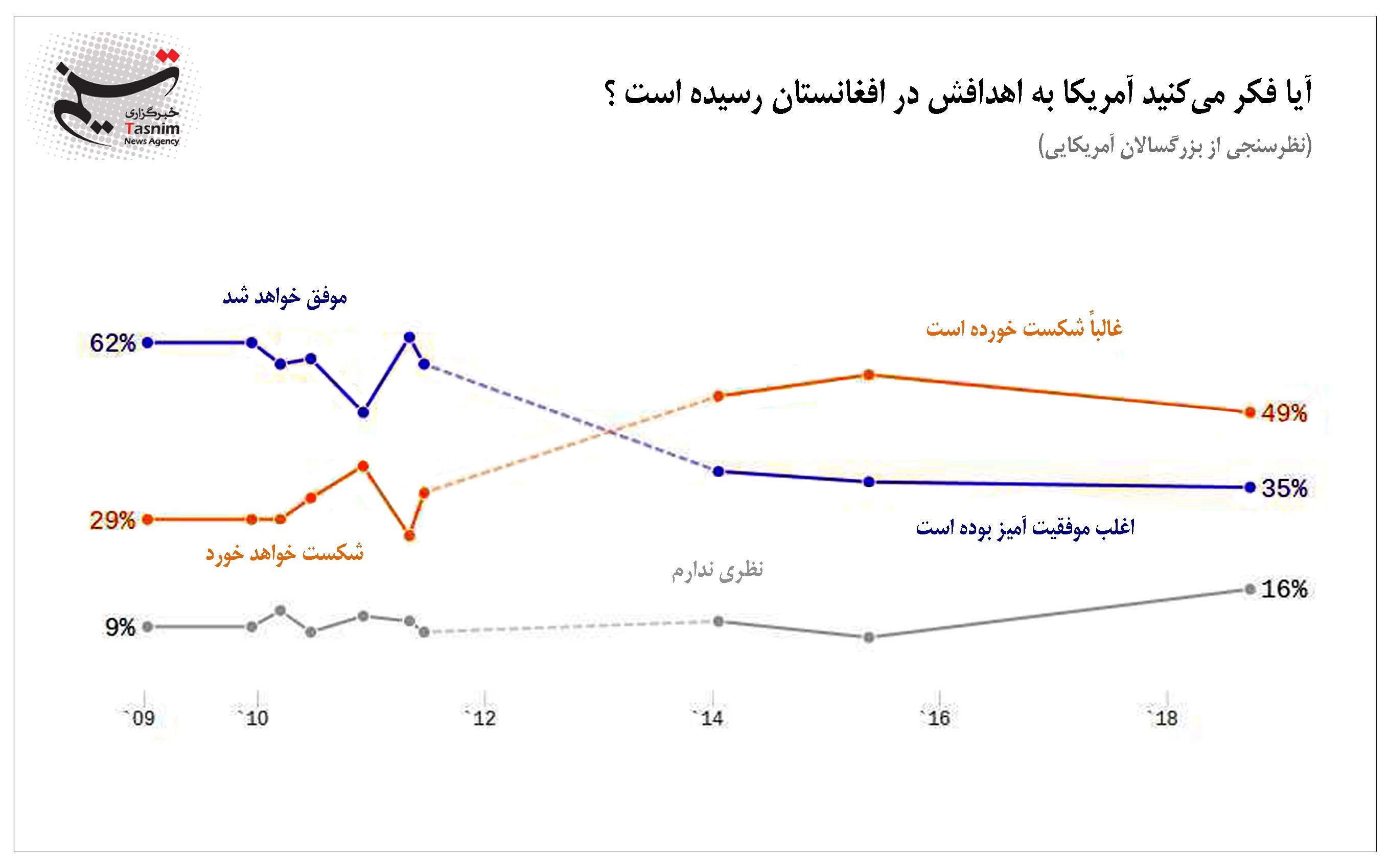 براساس نظرسنجی از هزار و 754 نفر از جوانان آمریکایی در رده سنی 18 تا 24 سال، شمار بیشتری از هواداران جمهوریخواهان در مقایسه با دموکراتها بر این باورند که آمریکا در دستیابی به اهدافش در افغانستان موفق بوده است.