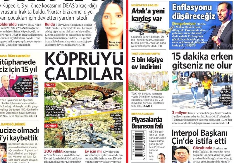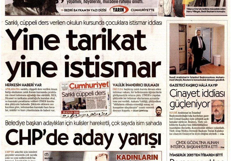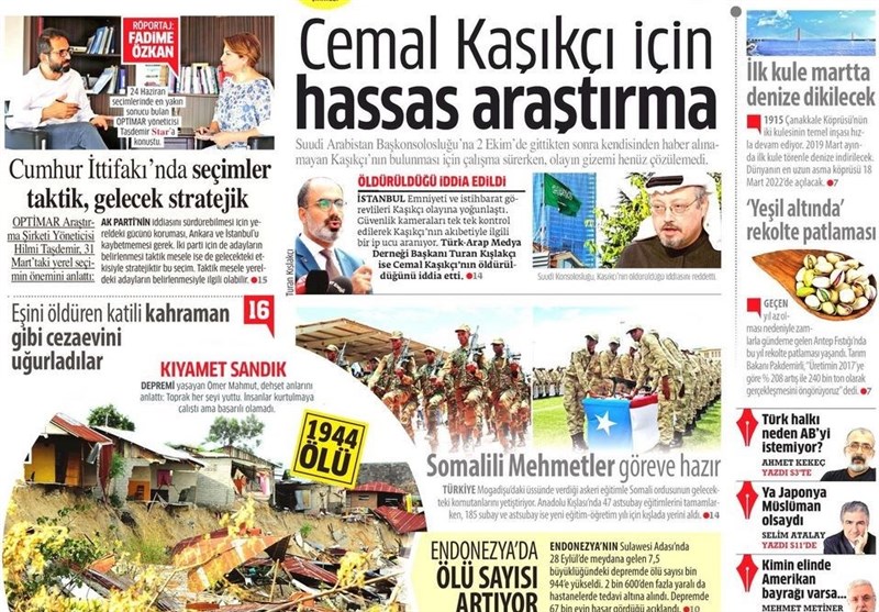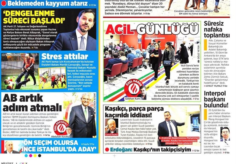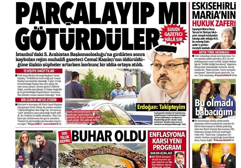 به گزارش گروه بین الملل خبرگزرای تسنیم، بسیاری از روزنامههای ترکیه، امروز در عکس و تیتر صفحه نخست، مساله جمال خاشقچی را برجسته کرده اند. همچنین این روزنامهها موضوعات دیگری مانند سخنان اردوغان در مورد وابستگی اقتصاد ترکیه به آمریکا در دوران عصمت اینونو را مورد توجه قرار دادهاند.
