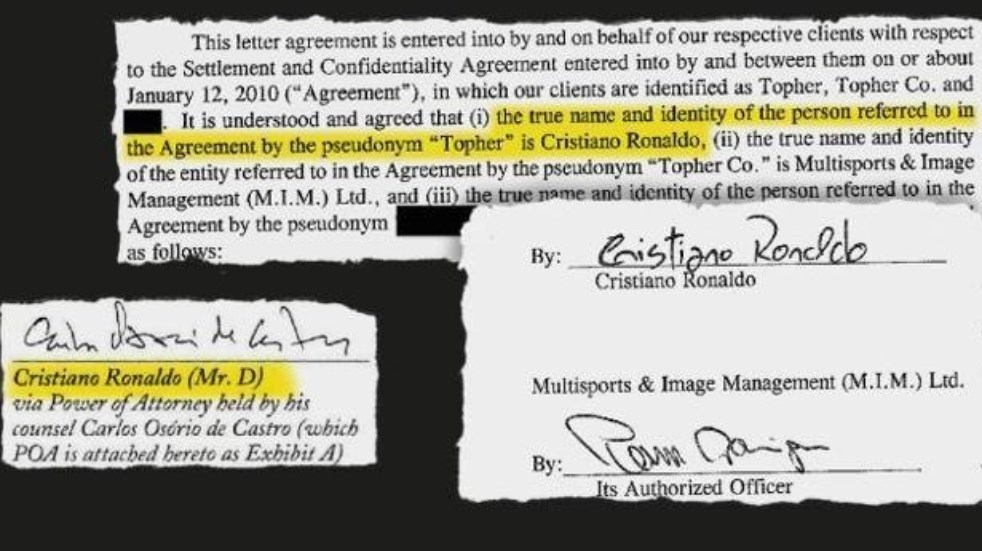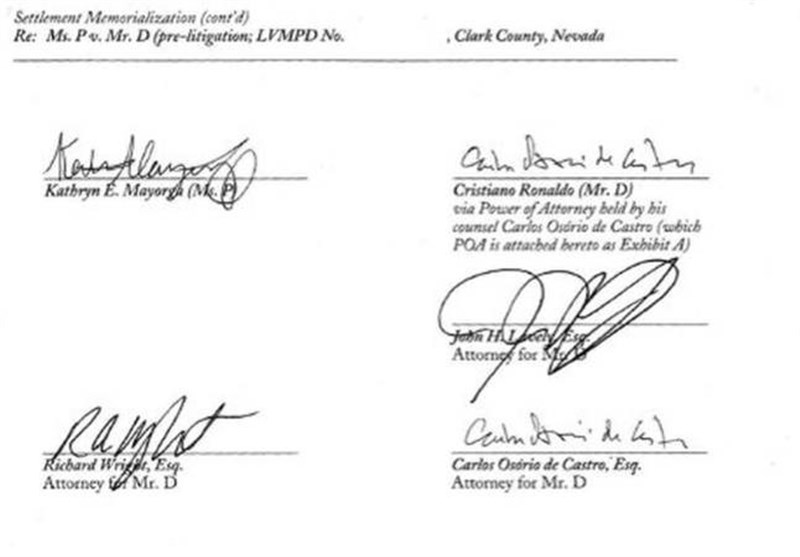در تصویری که اشپیگل از برگه توافق رونالدو و مایورگا برای سکوت درباره ماجرای تجاوز وی، منتشر کرده نام و امضای رونالدو دیده میشود. اشپیگل همچنین گزارشی از پلیس آمریکا که در آن مایورگا چند ساعت پس از تعرض رونالدو این اتفاق را گزارش کرده، منتشر کرده است.
