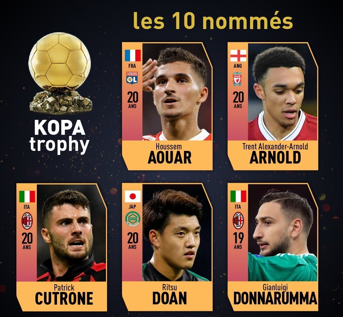 به گزارش خبرگزاری تسنیم، اسامی 10 کاندیدای کسب عنوان بهترین بازیکن جوان سال (کوپا) در سال 2018 توسط نشریه «فرانس فوتبال» به شرح زیر معرفی شد: حسین آئوار (فرانسه/ المپیک لیون)، ترنت الکساندر آرنولد (انگلستان/ لیورپول)، پاتریک کوترونه (ایتالیا/ میلان)، ریتسو دوان (ژاپن/ خرونیگن)، جانلوئیجی دوناروما (ایتالیا/ میلان)، آمادو حیدرا (مالی/ ردبول سالزبورگ)، جاستین کلایورت (هلند/ رم)، کایلان امباپه (فرانسه/ پاریسنژرمن)، کریستین پالیسیچ (آمریکا/ بورسیا دورتموند)، رودریگو (برزیل/ سانتوس).