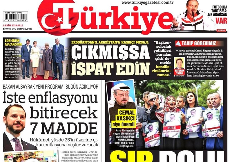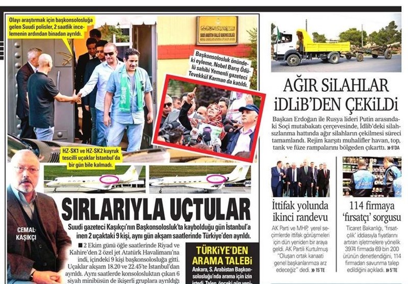 به گزارش گروه بینالملل خبرگزاری تسنیم، بسیاری از روزنامههای ترکیه، امروز در عکس و تیتر صفحه نخست، مساله خاشقجی را برجسته کردهاند. همچنین این روزنامهها موضوعات دیگری مانند خروج سلاحهای سنگین از ادلب را مورد توجه قرار دادهاند.