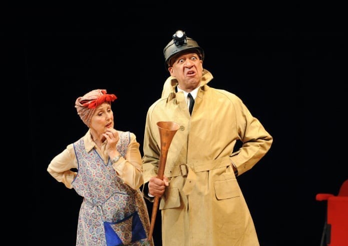 درک گریفیث در نقش اصلی نمایش «بازرس هاوند واقعی» تاماستوپارد، در کنار اونا استابز در نقش مینروا، چیچستر به سال 2010. عکس از ترسیتام کنتون (گاردین)