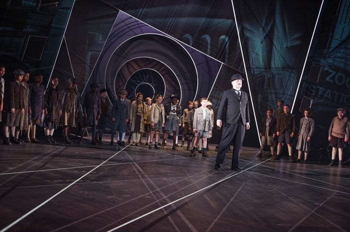 امیل و دارودسته کارآگاهش به دور آقای اسنوی شیطانصفت در اقتباس 2013 تئاتر ملی از «امیل و کارآگاه» اریک کاستنر. عکس از تریستام کنتون (گاردین)
