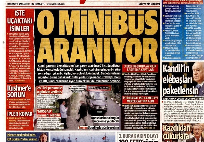 به گزارش گروه بینالملل خبرگزاری تسنیم، بسیاری از روزنامههای ترکیه، امروز در عکس و تیتر صفحه نخست، موضوع پیگیری سرنوشت خاشقجی را برجسته کردهاند. همچنین این روزنامهها موضوعات دیگری مانند تصمیمات اقتصادی دولت برای پایین آوردن قیمت کالاها را مورد توجه قرار دادهاند.