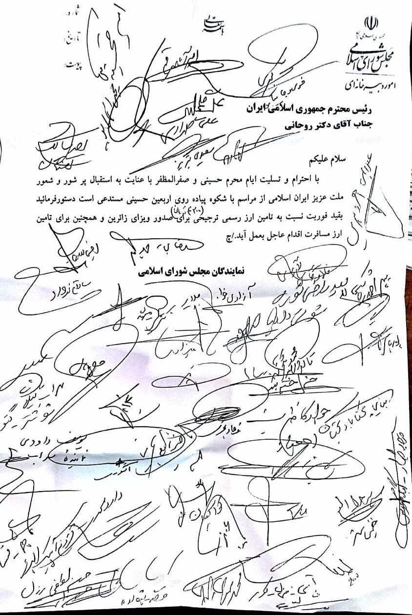 با احترام و تسلیت ایام محرم حسینی و با عنایت به استقبال پرشور و شعور ملت عزیز ایران اسلامی از مراسم باشکوه پیاده روی اربعین حسینی مستدعی است دستور فرمایید به قید فوریت نسبت به تامین ارز رسمی ترجیحی (4200) برای صدور ویزای زائرین و همچنین برای تامین ارز مسافرت اقدام عاجل به عمل آید.