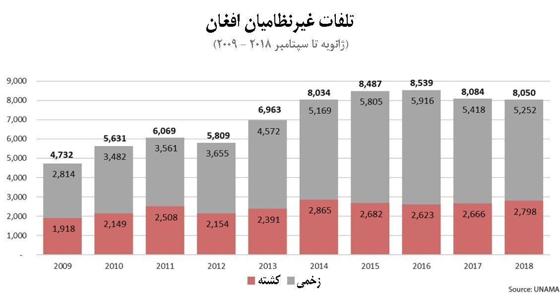 به گزارش دفتر منطقهای خبرگزاری تسنیم، براساس گزارش تازه دفتر نمایندگی سازمان ملل در افغانستان موسوم به «یوناما» از ژانویه تا سپتامبر سال جاری 8 هزار و 50 غیرنظامی در افغانستان کشته و یا زخمی شدند.