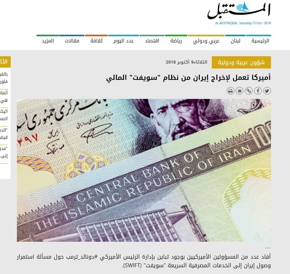 روزنامه المستقبل این هفته در گزارش دیگری با عنوان «تلاش ترامپ برای منع استفاده ایران از سیستم مالی سوئیفت» نوشته است: در آمریکا هم اکنون یک دوگانگی در این مسئاله پیش آمده است و برخی خواهان ادامه استفاده ایران از سوئیفت و جریان دیگر به رهبری ترامپ و بولتون خواهان قطع این سیستم برای ایران هستند. براین اساس ترامپ هرگونه تلاش برای روابط اقتصادی با ایران را درست نمی داند و با آغاز دوره جدید تحریم ها علیه ایران از چهارم نوامبر آینده می خواهد همه روزنه های باقی مانده اقتصادی برای ایران را مسدود کند. در ادامه این گزارش به اظهارات یکی از مدیران سوئیفت اشاره شده که طی آن تاکید کرده قوانین اتحادیه اروپا در تعامل مالی با ایران، طی ماه های اخیر با وجود تحریم های آمریکا هیچ تغییری نکرده است و آنها به روابط خود با ایران ادامه می دهند.