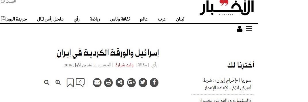 الاخبار این هفته در گزارشی با عنوان «اسرائیل و استفاده از برگه کُردها در ایران» به ابعاد نقش آفرینی رژیم صهیونیستی در تلاش برای اجرای پروژه تجزیه ایران اشاره کرده است. «ولید شراره» نویسنده این سطور تاکید می کند: إسرائیل همواره تلاش کرده خودش را به عنوان یک عنصر مهم راهبردی به طرف آمریکایی جهت پیشبرد اهداف واشنگتن در منطقه مطرح کند تا این ایده که اسرائیل سر بار آمریکا شده است را زیر سوال ببرد. بر همین اساس بسیاری معتقدند که اسرائیل به ویژه پس از اشغال آمریکا توسط عراق همه قوای خود را در خدمت به اهداف واشنگتن بسیج کرد. این مسئله هرگز بر کسی پوشیده نیست که ایده سرنگونی دولت وقت عراق و تشکیل نظام فدرالی براساس مسائل طایفهای و نژادی و همچنین ایده خاورمیانه جدید از اتاق فکرهای اسرائیل برآمده بود. در همین راستا بود که نئو محافظه کاران که اکثر آنها از صهیونیست های افراطی بودند برای ترویج این ایده ها در دوران جرج بوش کمر همت بسته و به طور جدی وارد عمل شدند. در تحولات اخیر به نظر می رسد دولت ترامپ در نظر دارد از همین ایده های اسرائیلی البته این بار علیه ایران بهره برداری کند، در همین راستا از زمان تشکیل گروه اقدام علیه ایران در 16 اوت گذشته حملات و تحرکات ضد نظام ایران افزایش قابل ملاحظه ای داشته که در اقدامات گروههای جدایی طلب کُردی و عربی این مسئله دیده شده است، گروههایی که نیت خود برای تشکیل ائتلاف علیه ایران را علنی اعلام کرده اند. به طور قطع این گونه اقدامات کاملا در راستای اهداف تیم مرکز پژوهشی لابی اسرائیلی در آمریکا (انستیتو تحقیقات خاورمیانهای واشنگتن) قرار دارد، پژوهشکده ای که جان بولتون مشاور امنیت ملی و جیمز جفری، دیوید شنکر و اندرو تابلر از مقامات ارشد سیاسی امنیتی آمریکا تشکیل شده است.
