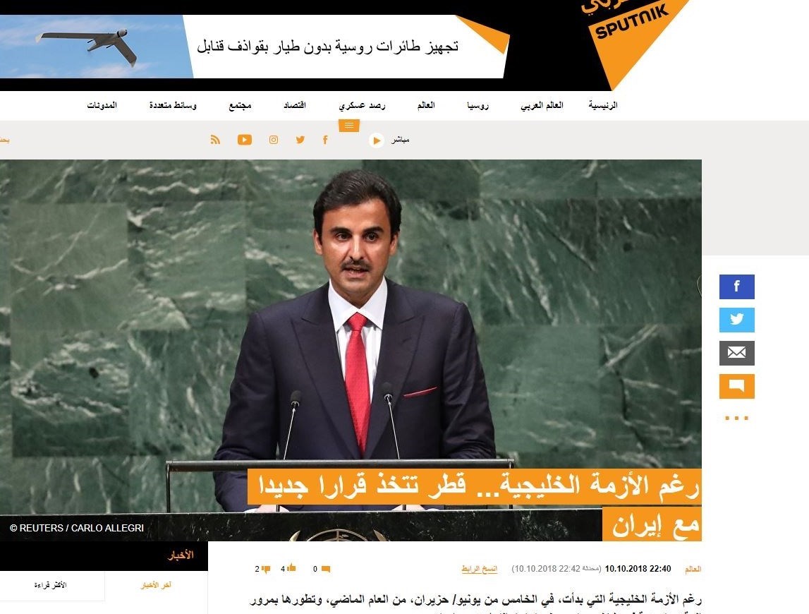 پایگاه اسپوتنیک عربی در گزارشی با عنوان «قطر در اوج بحران روابط میان کشورهای عربی حاشیه خلیج فارس، تصمیم جدیدی در زمینه روابط اقتصادی با ایران گرفت»، می نویسد: با وجود بحران روابط کشورهای عربی حاشیه خلیج فارس که از پنجم ژوئیه 2018 آغاز شده، قطر همچنان عامدانه به تقویت روابط با ایران ادامه می دهد.