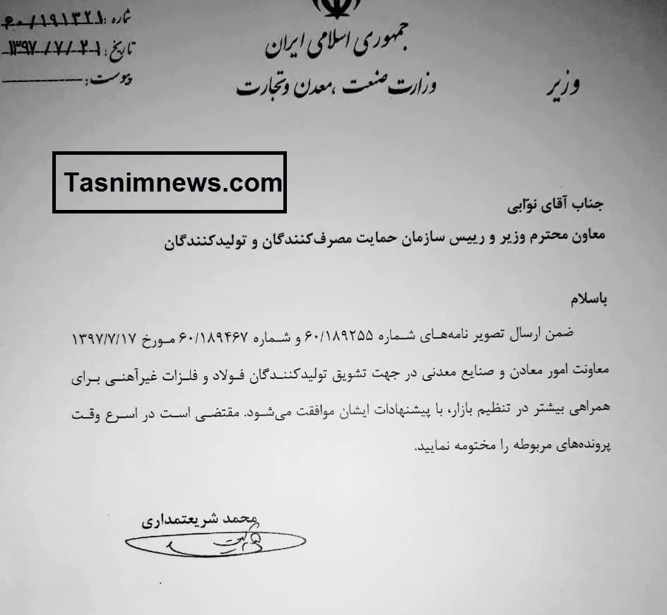 در این مکاتبه ضمن ارسال تصویر نامه های معاون امور معاون وزیر صنعت در جهت تشویق تولیدکنندگان فولاد و فلزات غیر آهنی برای همراهی بیشتر در تنظیم بازار آمده است، مقتضی است در اسرع وقت پرونده های مربوطه را مختومه کنید.