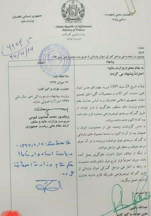 وزارت دارایی افغانستان در نامهای از ریاست گمرک ولایت فراه خواسته تا ممنوعیت وارداتی بر کالاهای ایرانی از گذرگاه مرزی ابونصرفراهی را بردارد.