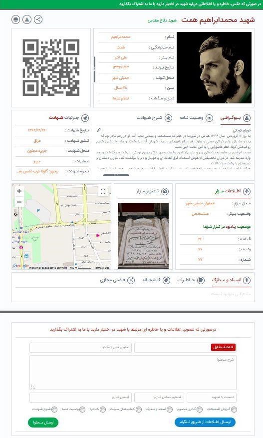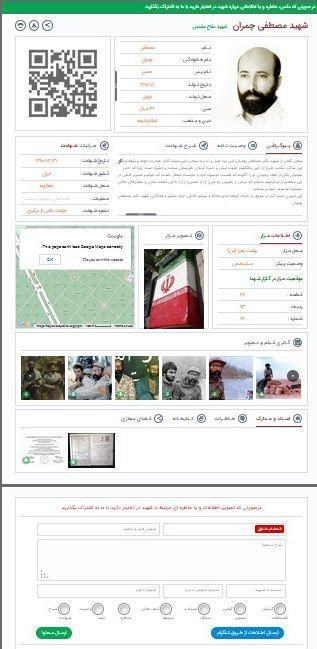 در این سامانه که در فاز اول ویژه شهدای استان تهران و استان البرز میباشد, هر شهید دارای یک صفحه اختصاصی بوده و در این صفحه میتوان اطلاعات اولیه شهید، جزئیات شهادت و اطلاعات مزار شهید و تصویر مزار شهید همراه با بارکدخوان و GPS را مشاهده کرد. این صفحه در آینده نزدیک با تکمیل شدن بیوگرافی, وصیت نامه و شرح شهادت، اسناد و مدارک و خاطرات شهدا می تواند گام بزرگی در راه فرهنگ ایثار و شهادت را بردارد.