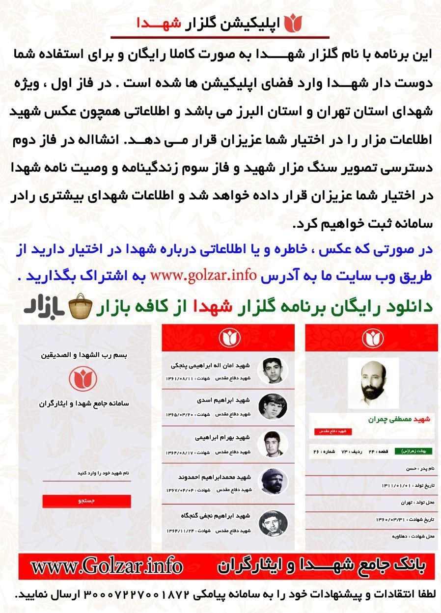 با توجه به استقبال از سامانه جامع شهدا و ایثارگران و درخواست خانواده شهدا و ایثارگران نرم افزار اندروید این سامانه نیز برای استفاده کاربران در تلفن همراه نیز تولید شده که می توانید این برنامه را به صورت رایگان از کافه بازار با عنوان گلزار شهدا و از اینجا دریافت کنید.