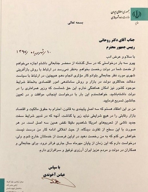 به گزارش خبرنگار اقتصادی خبرگزاری تسنیم، عباس آخوندی وزیر راه و شهرسازی نامه استعفای خود را در کانال تلگرامیاش منتشر کرد.