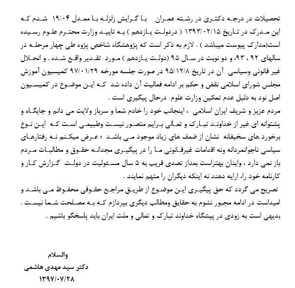 این در حالی است که سید مهدی هاشمی در واکنش به مسائل مطرحشده از سوی وزیر مستعفی راه و وزیر علوم نامهای را بههمراه یک کپی از مدارک تحصیلی خود منتشر کرد.