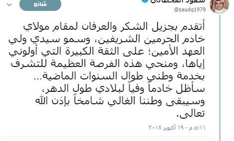 القحطانی در پی برکناری‌اش گفته است: از مقام مولای خود خادم الحرمین الشریفین و جناب آقایش ولیعهد امین به‌خاطر  اعتماد زیادی که به من دادند و این فرصت عظیم را برای خدمت‌ به وطنم در طول سالیان گذشته دادند، کمال تشکر و قدردانی را دارم، همچنان خدمتگزار وفادار کشورم باقی خواهم ماند... .