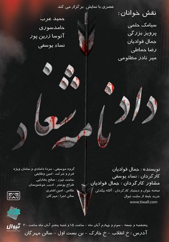نمایشنامه «دادنامه شغاد» روزهای پنجشنبه و جمعه ، سوم و چهارم آبان ماه ساعت 15 و روز شنبه پنجم آبان ماه ساعت 20، در خانه نمایش «مهرگان» به نشانی: خیابان انقلاب، نرسیده به پل کالج، خیابان خارک، بنبست اول.