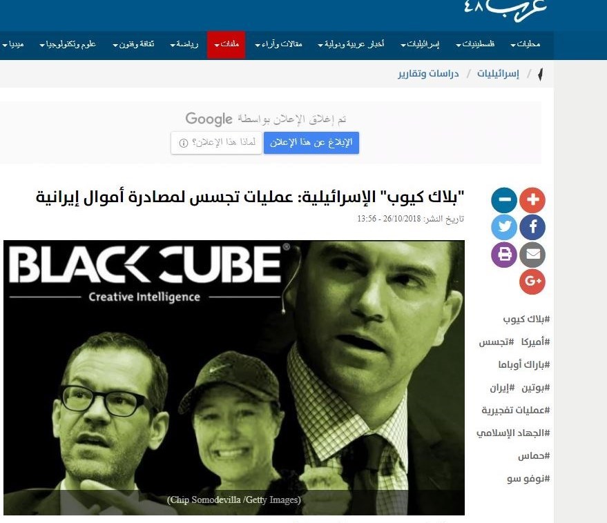 پایگاه فلسطینی عرب 48 در روز جمعه 26 اکتبر در گزارشی به فعالیت یک شرکت رژیم صهیونیستی تحت عنوان «بلک کیوب» در روند تشدید تحریم ها علیه ایران اشاره کرده است.
