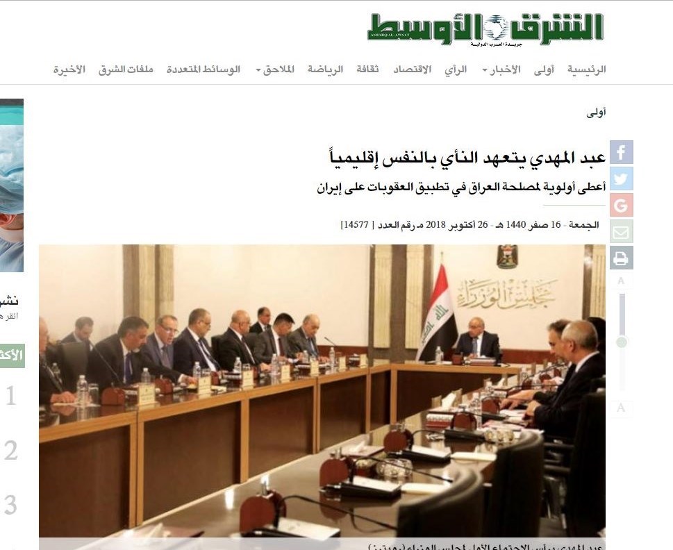 روزنامه الشرق الاوسط در گزارشی در روز جمعه 26 اکتبر نخستین نشست کابینه جدید عراق به ریاست عادل عبدالمهدی را پوشش داده است.