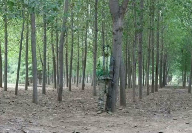 "ﻟﻴﻮ ﺑﻮﻟﻴﻦ" نقاش چینی طی یک هنر ابتکاری چهره و لباسهایش را طوری نقاشی می‌کند که انگار در محیط محو شده است.
