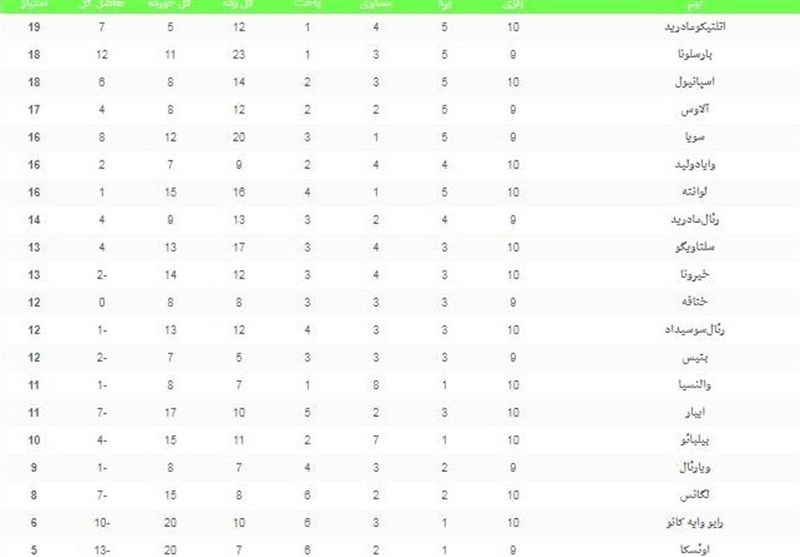 فوتبال جهان| جدول رده‌بندی لالیگا در پایان شب دوم از هفته دهم