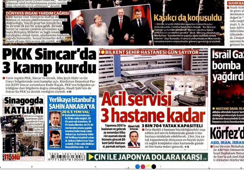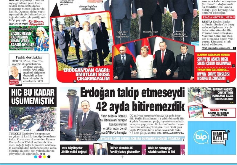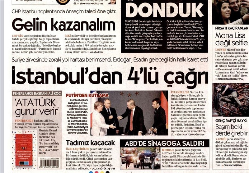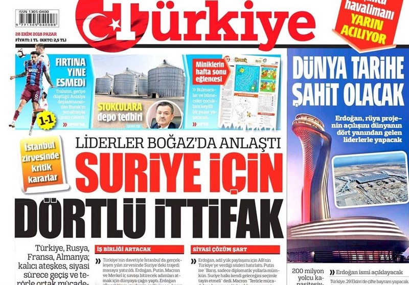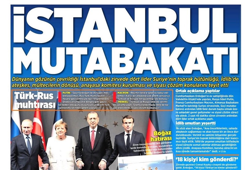 به گزارش گروه بین‌الملل خبرگزاری تسنیم، بسیاری از روزنامه‌های ترکیه، امروز در عکس و تیتر صفحه نخست،  برگزاری نشست چهارجانبه استانبول را برجسته کرده‌اند. همچنین این روزنامه‌ها موضوعات دیگری مانند تشییع جنازه دو نظامی ترکیه که بر اثر سرما زدگی جان خود را از دست داده بودند را مورد توجه قرار داده‌اند.