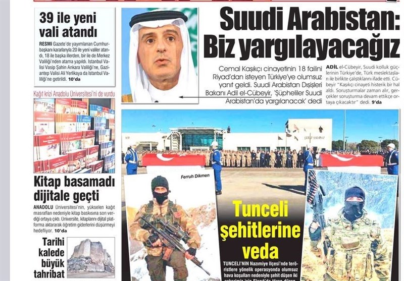 نشریات ترکیه در یک نگاه|دستگاه قضا، خواهان استرداد 18 عامل قتل خاشقجی به ترکیه/ اردوغان: حالا نوبت شرق فرات است