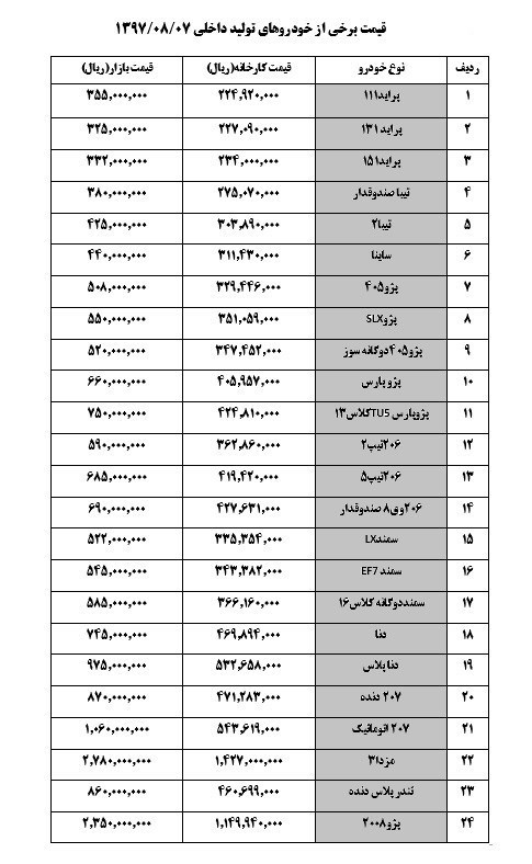 قیمت تعدادی از خودروهای داخلی در بازار امروز به شرح زیر است: