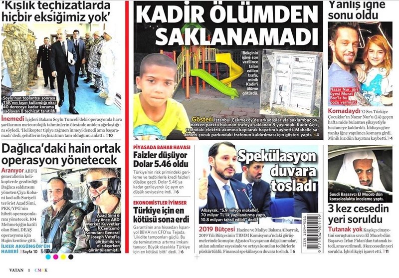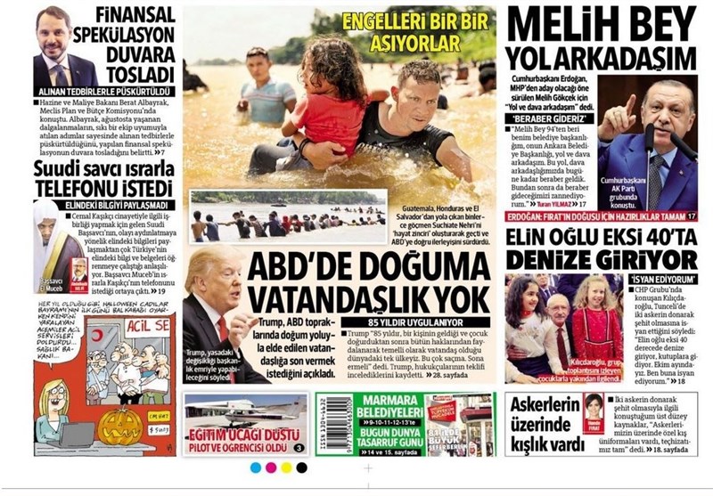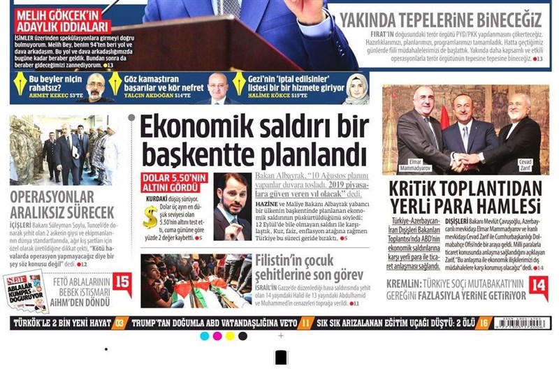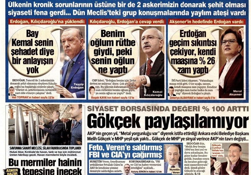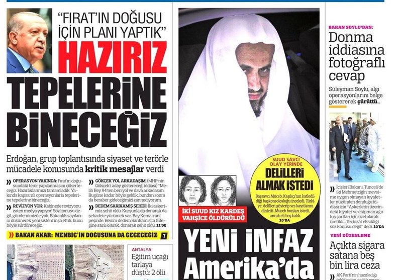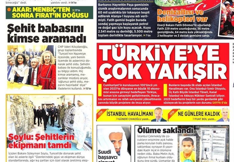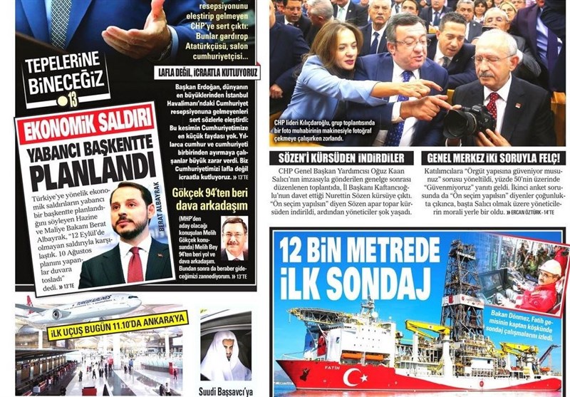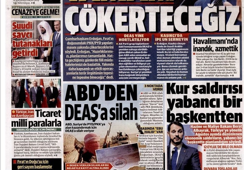 به گزارش گروه بینالملل خبرگزاری تسنیم، بسیاری از روزنامههای ترکیه، امروز در عکس و تیتر صفحه نخست، سخنان اردوغان در مورد حمله به شرق فرات را برجسته کردهاند. همچنین این روزنامهها موضوعات دیگری مانند تنش و اختلاف بین احزاب ترکیه را مورد توجه قرار دادهاند.
