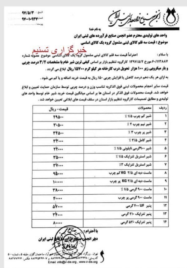 3 مرداد ماه سال جاری انجمن صنایع لبنی طی نامه ای به اعضای خود اعلام کرد که قیمت لبنیات با مجوز کارگروه تنظیم بازار رسما افزایش یافت که این افزایش قیمت در برخی از محصولات بسیار چشم گیر بود، به طور مثال نرخ (مصوب ) شیر پرچرب یک لیتری (3 درصد چربی) از 2800 تومان به 3700 تومانی افزایش یافته است.