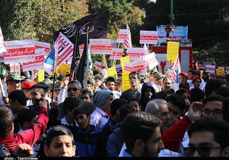 به گزارش خبرگزاری تسنیم از شهرستان‌های استان تهران، مراسم راهپیمایی 13 آبان امسال در شهرستان‌های استان تهران متفاوت‌ و باشکوه‌تر از سال‌های گذشته برگزار شد، راهپیمایان یک‌صدا فریاد «مرگ بر آمریکا»، «مرگ بر اسرائیل» و «ای رهبر آزاد آماده‌ایم آماده» سر داده و خشم و انزجار خود را از سیاست‌های آمریکا اعلام کردند.