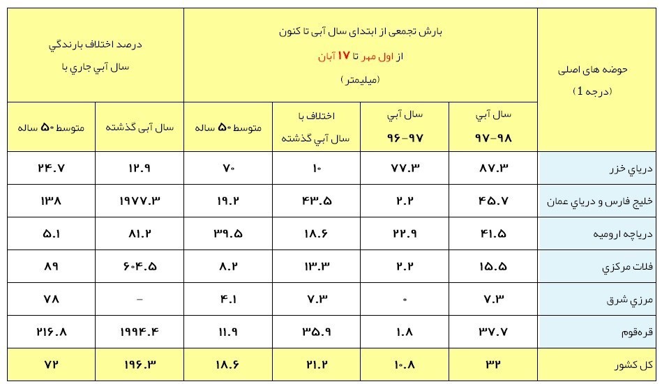 به گزارش خبرنگار اقتصادی خبرگزاری تسنیم، بر اساس اطلاعات رسمی دفتر مطالعات پایه منابع آب شرکت مدیریت منابع آب ایران، ارتفاع کل ریزشهای جوی از اول مهر تا 17 آبان سال آبی 98-97 بالغ بر 32 میلیمتر است.