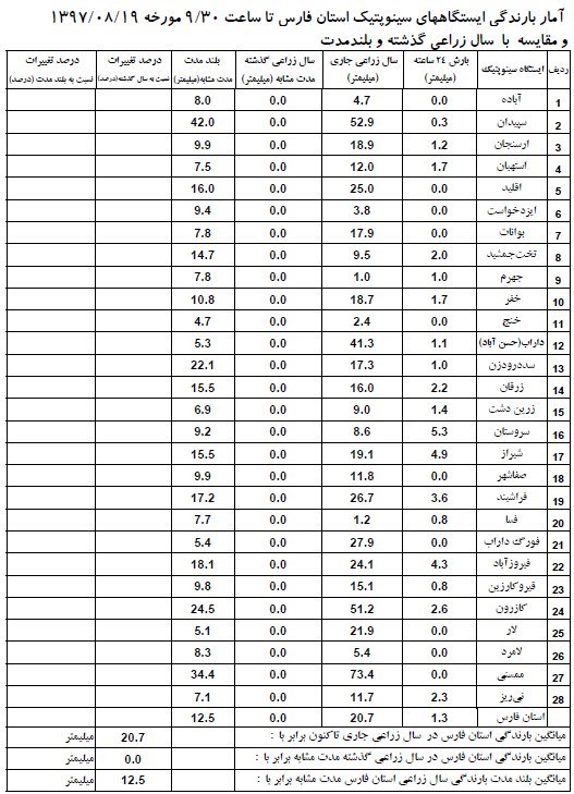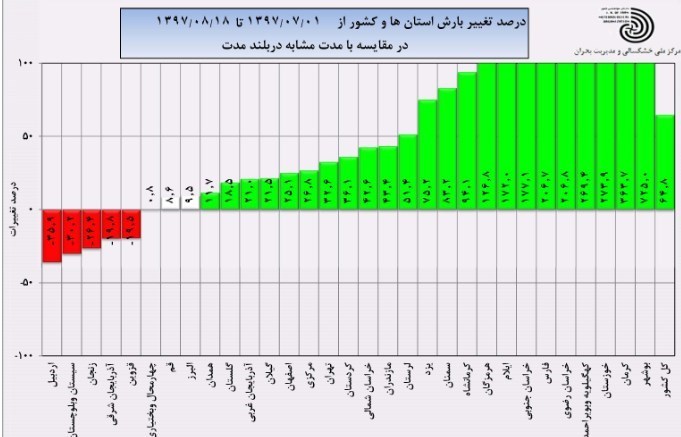 درصد تغییرات بارش استانها (از اول مهرماه امسال تا 18 آبانماه) در مقایسه با مدت مشابه بلندمدت حاکی از افزایش 64.8 درصدی بارشها در کل کشور است، استان فارس 206.7 درصد ششمین استان کشور در این زمینه است.