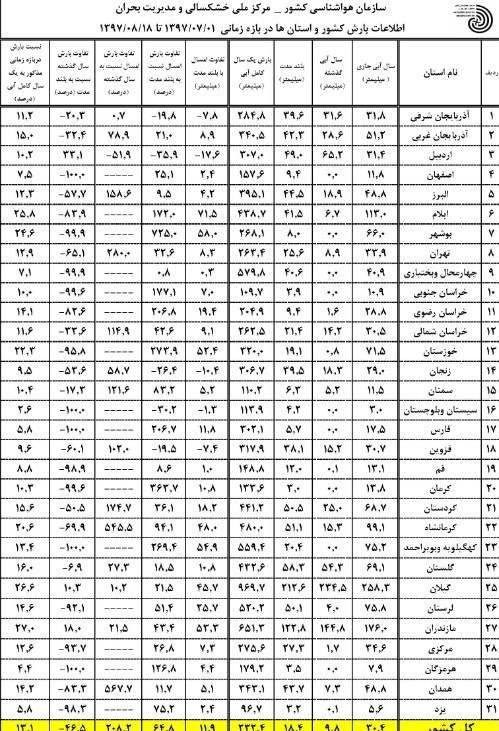 براساس اطلاعات مرکز ملی خشکسالی و مدیریت بحران از ابتدای سال زراعی جاری تا 18 آبانماه میانگین بارندگی در کل کشور 30.4 میلیمتر بوده است. گیلان با 258.3 میلیمتر باران پربارشترین استان و سیستان و بلوچستان با 3 میلیمتر باران کمبارشترین استان کشور بوده است.