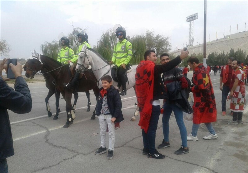 * حضور پلیسهای اسبسوار در ورزشگاه باعث شده است هواداران نسبت به این موضوع واکنش مثبتی نشان دهند و با آنها عکس سلفی بگیرند.