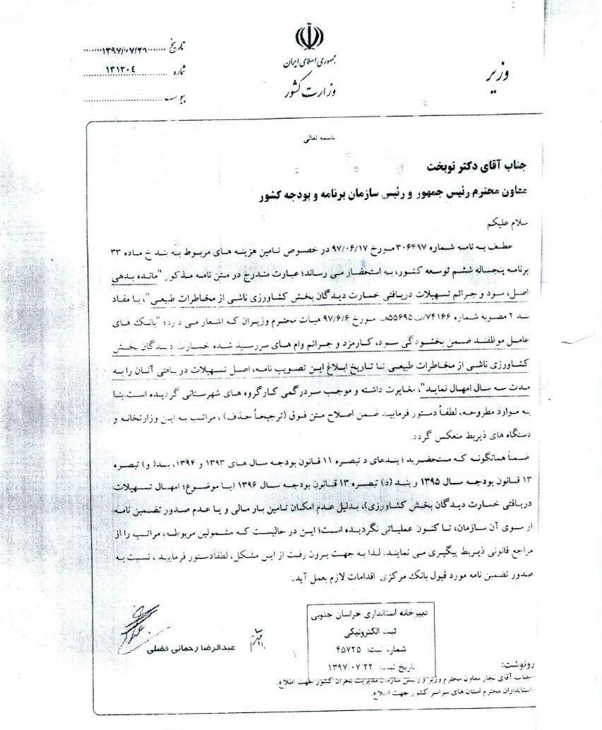 عطف به نامه شماره 306497 مورخ 17 شهریور 97 در خصوص تامین هزینههای مربوط به بند خ ماده 33 برنامه پنج ساله ششم توسعه کشور، به استحضار میرساند، عبارت مندرج در متن نامه مذکور «مانده بدهی اصل، سود و جرائم تسهیلات دریافتی خسارت دیدگان بخش کشاورزی ناشی از مخاطرات طبیعی»، با مفاد بند 2 مصوبه شماره 74166 ت 55695هـ مورخ 6 شهرویر 97 هیات محترم وزیران که اشعار میدارد «بانکهای عامل موظفند ضمن بخشودگی سود، کارمزد و جرائم وام های سر رسید شده خسارت دیدگان بخش کشاورزی ناشی از مخاطرات طبیعی تا تاریخ ابلاغ این تصویب نامه، اصل تسهیلات دریافتی آنان را به مدت سه سال امهال نماید»، مغایرت داشته و موجب سردرگمی کار گروههای شهرستانی گردیده است. بنا به موارد مطروحه، لطفاً دستور فرمایید ضمن اصلاح متن فوق (ترجیحاً حذف)، مراتب به این وزارتخانه و دستگاههای ذیربط منعکس گردد.