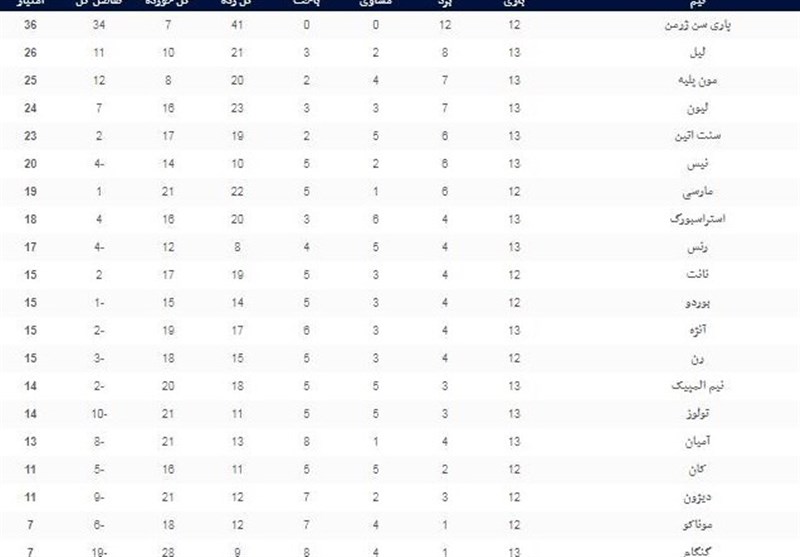 فوتبال جهان| جدول رده‌بندی لوشامپیونه در پایان شب دوم از هفته سیزدهم