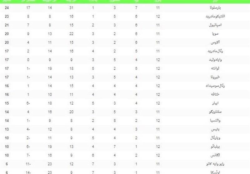 فوتبال جهان| جدول رده‌بندی لالیگا در پایان شب دوم از هفته دوازدهم