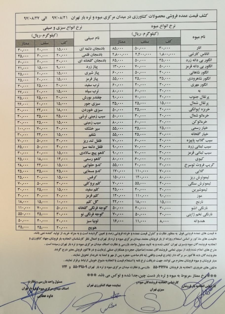 قیمت عمده فروشی 60 قلم میوه و تره بار تا 13 آبان + جدول
