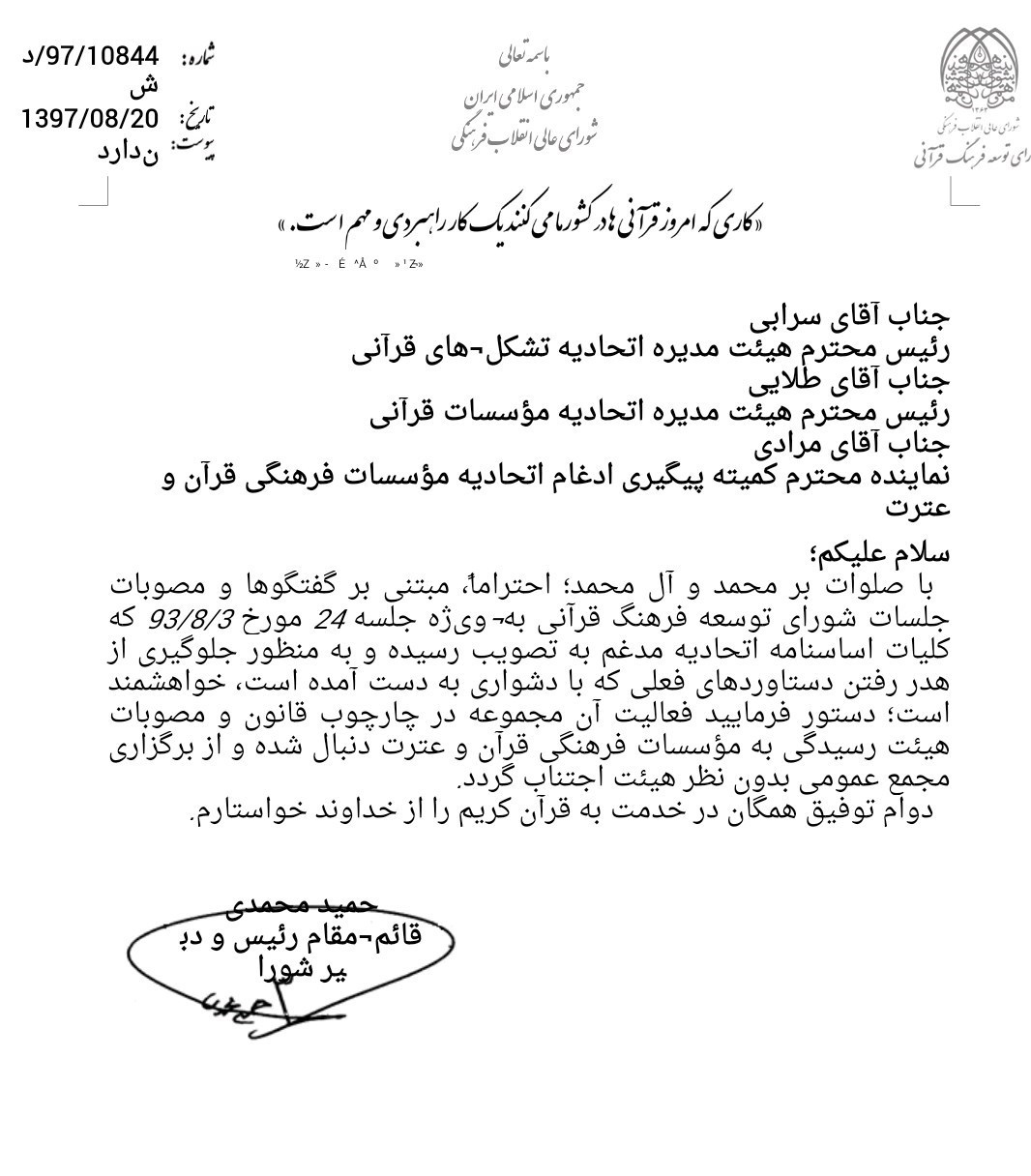 در بخشی از این نامه آمده است؛ «به منظور جلوگیری از هدر رفتن دستاوردهای فعلی که با دشواری به دست آمده است؛ دستور فرمایید فعالیت آن مجموعه در چارچوب قانون و مصوبات هیئت رسیدگی به مؤسسات فرهنگی قرآن و عترت دنبال شده و از برگزاری مجمع عمومی بدون نظر هیئت اجتناب شود».