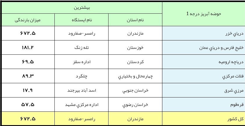 در جدول زیر، پربارشترین نقاط هر حوضه آبریز کشور (برحسب میلیمتر) نشان داده شده است.