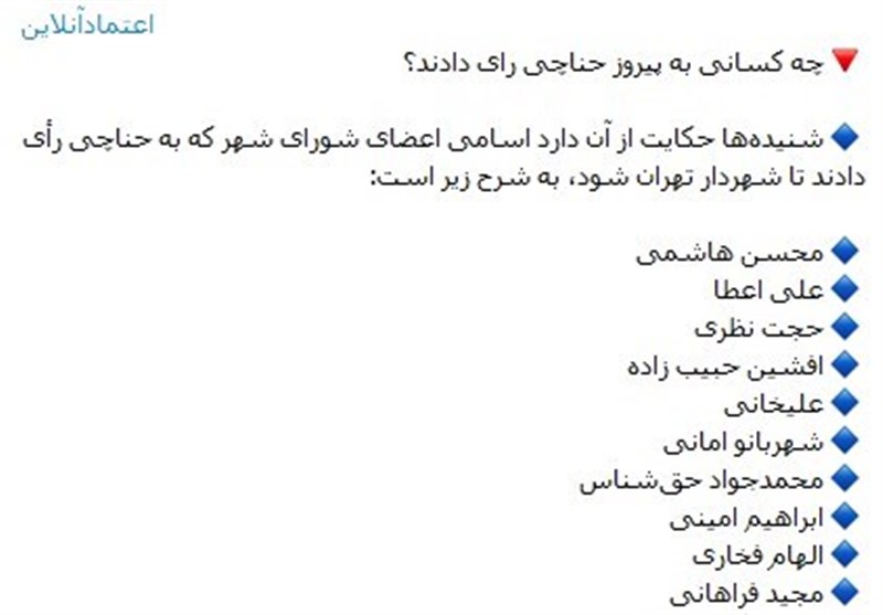 پیروز حناچی تنها با اختلاف یک رأی نسبت به آخوندی توانست شهردار جدید پایتخت شود، در همین رابطه کانال اعتماد آنلاین وابسته به حزب اعتماد ملی اسامی کسانی را که در انتخابات امروز به پیروز حناچی رأی دادند منتشر کرده است.