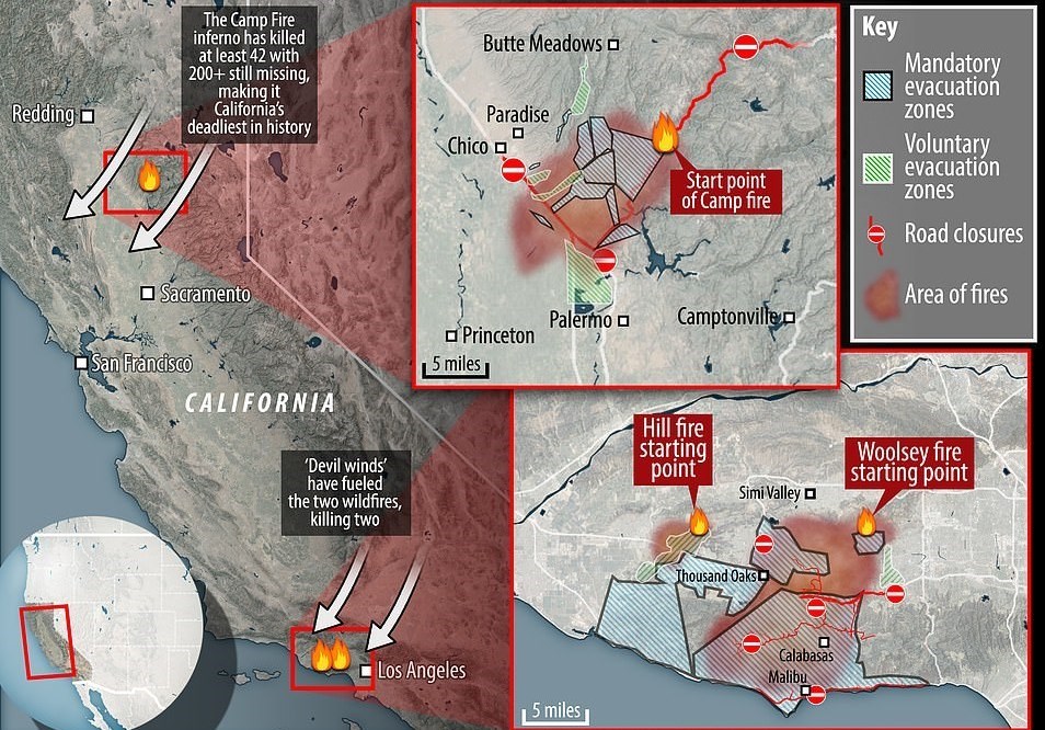 روزنامه نیویورکتایمز نوشته آتشسوزیهای «کمپ» و «وولزی» که شمال و جنوب کالیفرنیا را در بر گرفتهاند در مناطقی اتفاق افتادهاند که اجتماعات انسانی در نزدیکی مناطق بکر طبیعی تشکیل شدهاند و به همین دلیل آتش با سهولت بیشتری از جنگلها یا چمنزارها به خانهها سرایت میکند.